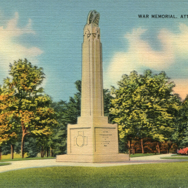 Transcription: Postmarked: History and Notes: Context: Main Image: The postcard features a colored image of the War Memorial located in Attleboro, Massachusetts. Details: Foreground: The...