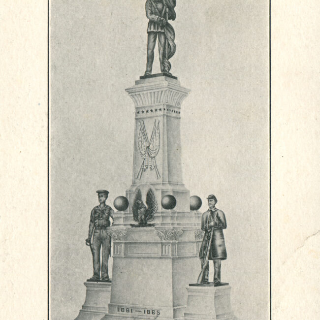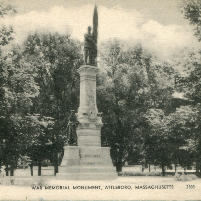 Transcription: Postmarked: History and Notes: Context: Main Image: The postcard features a black and white photograph of the Soldiers’ Monument in Attleboro, Massachusetts. Details: Foreground:...