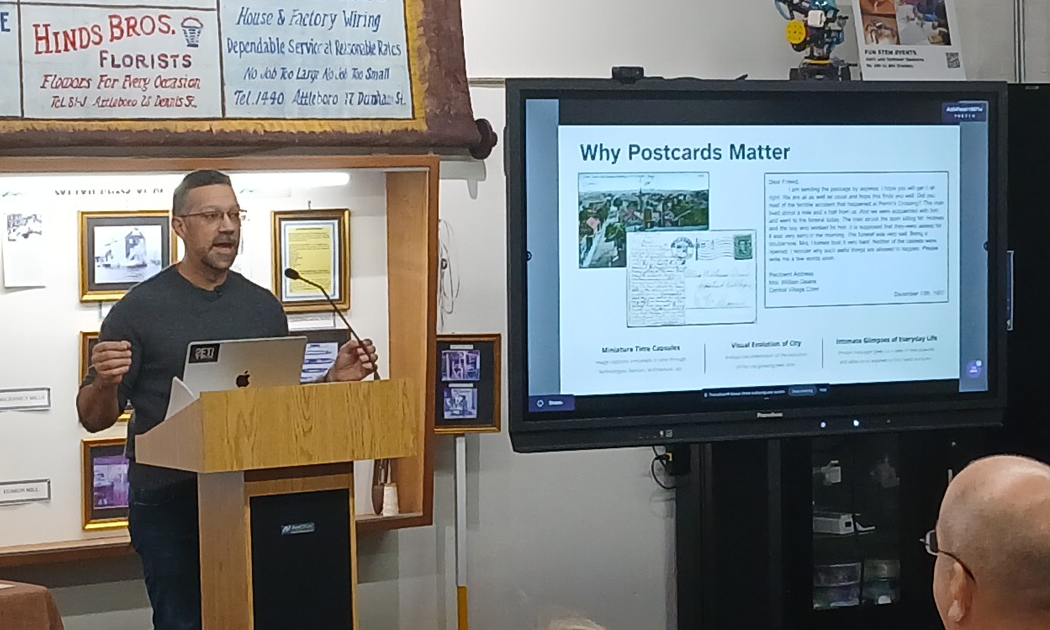 Shawn guided the audience through the story behind the book, its inspiration, research process, and the remarkable historical details hidden within Attleboro’s early postcards. He also shared insights from his ongoing Then/Now Project, which pairs the century-old postcard views with modern photographs of the same locations. These comparisons sparked lively conversations about how the city has changed and what has stayed the same.