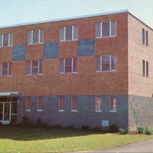 Transcription: Postmarked: History and Notes: Context: Main Image: The postcard features a color photograph of a modern educational building, possibly a school or college dormitory,...