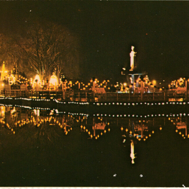 Transcription: Postmarked: History and Notes: Context: Main Image: The postcard showcases a nighttime scene featuring a beautifully lit area with reflections on a water body....