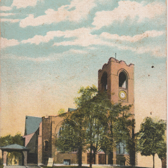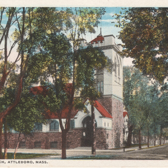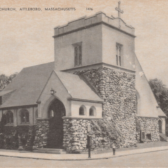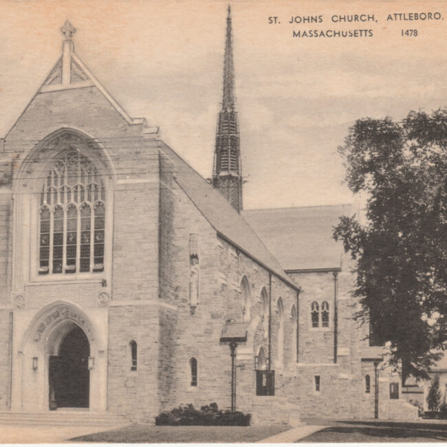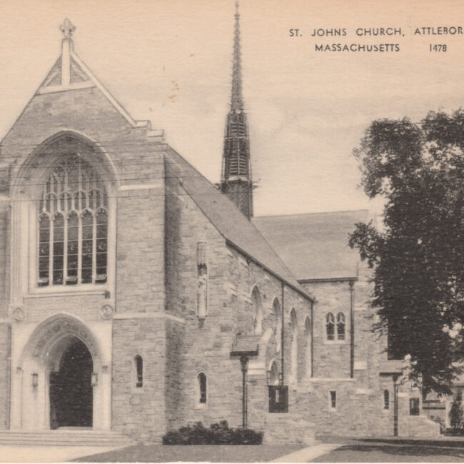 Transcription: Postmarked: History and Notes: Context: Main Image: The postcard features a black-and-white photograph of St. John’s Church in Attleboro, Massachusetts. Details: Architecture: The church...