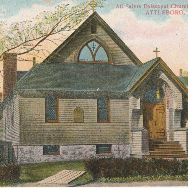 Transcription: Postmarked: History and Notes: Context: Main Image: The postcard showcases a black-and-white photograph of All Saints Church in Attleboro, Massachusetts. Details: Architecture: The church...