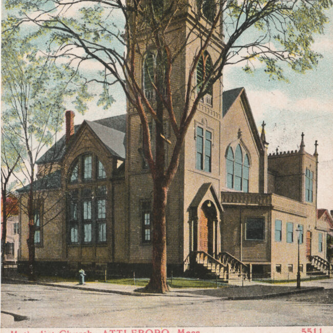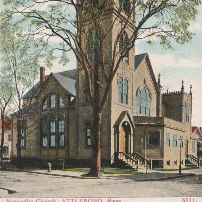 Transcription: Postmarked: History and Notes: Context: Main Image: The postcard features a sepia-toned photograph of St. John’s Church in Attleboro, Massachusetts. Details: Architecture: The church...