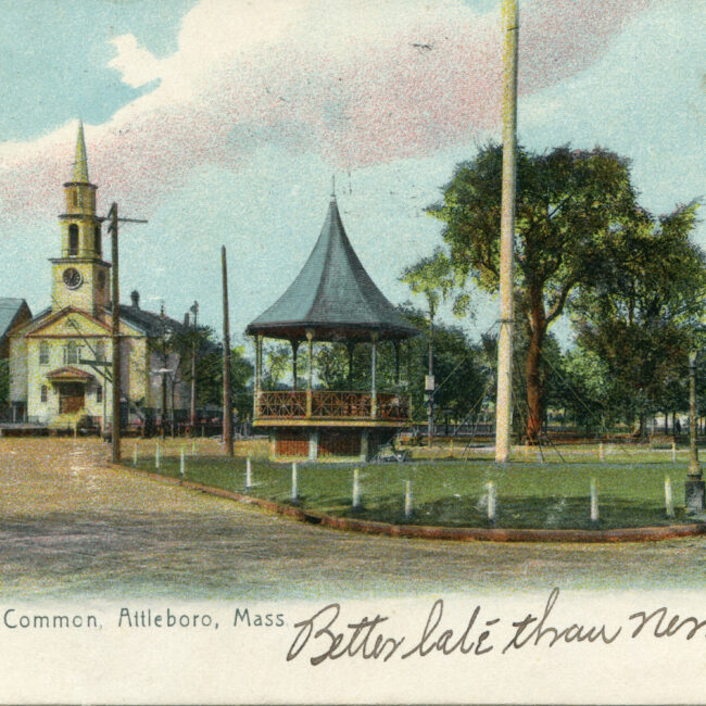 Transcription: Postmarked: History and Notes: Context: Main Image: The postcard features a view of Park Street in Attleboro, Massachusetts, as seen from the Railroad (R.R.)...