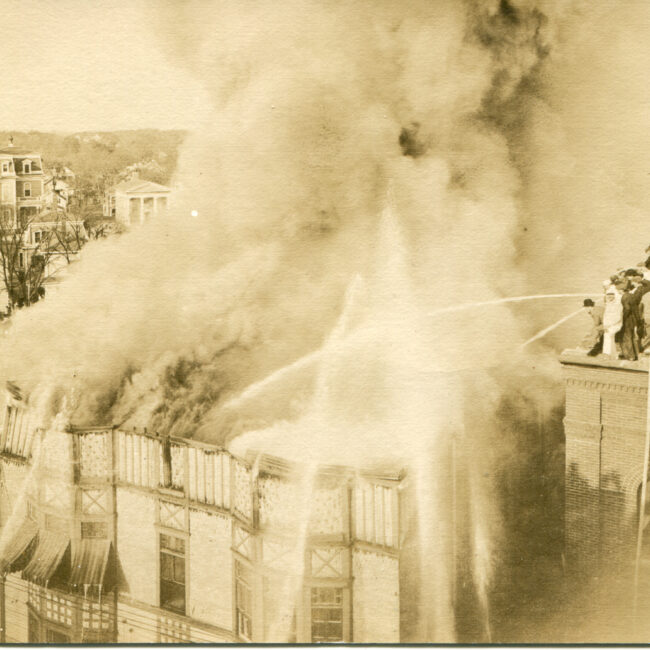 Transcription: Postmarked: History and Notes: Context: Title: Fire Scene Main Image: This postcard captures an intense scene of a building fire. Smoke billows from the...