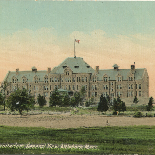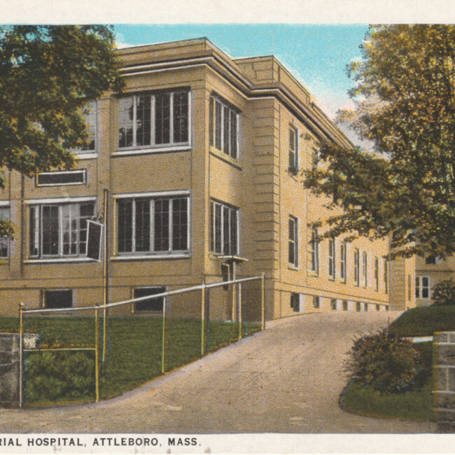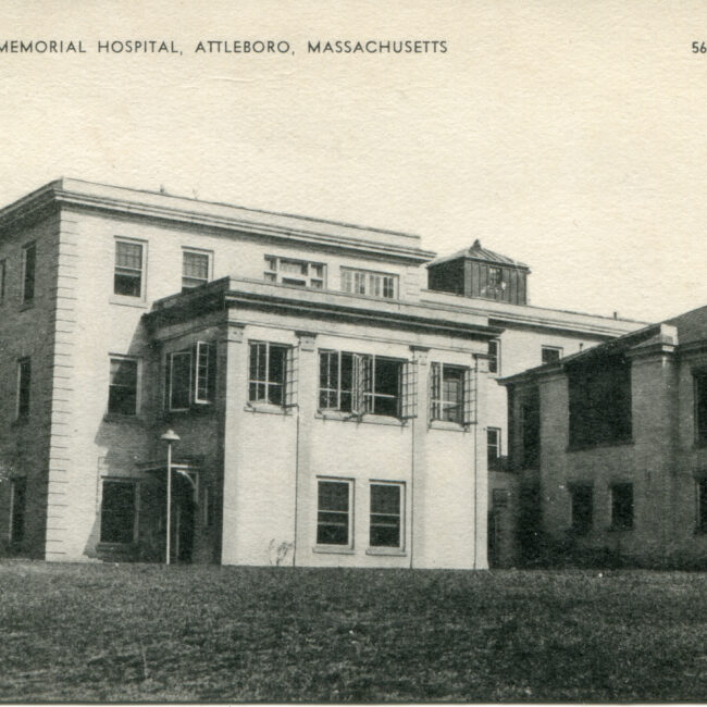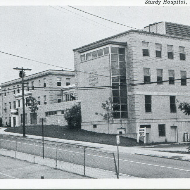 Transcription: Postmarked: History and Notes: Context: Title: Sturdy Hospital, Attleboro, Mass. Main Image: The postcard features a black-and-white photograph of Sturdy Memorial Hospital in Attleboro,...