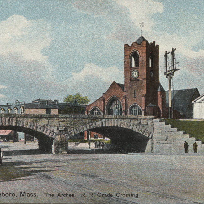 Transcription: Postmarked: History and Notes: Context: Main Image: The postcard features a picturesque view of The Arches and the Railroad Grade Crossing in Attleboro, Massachusetts....