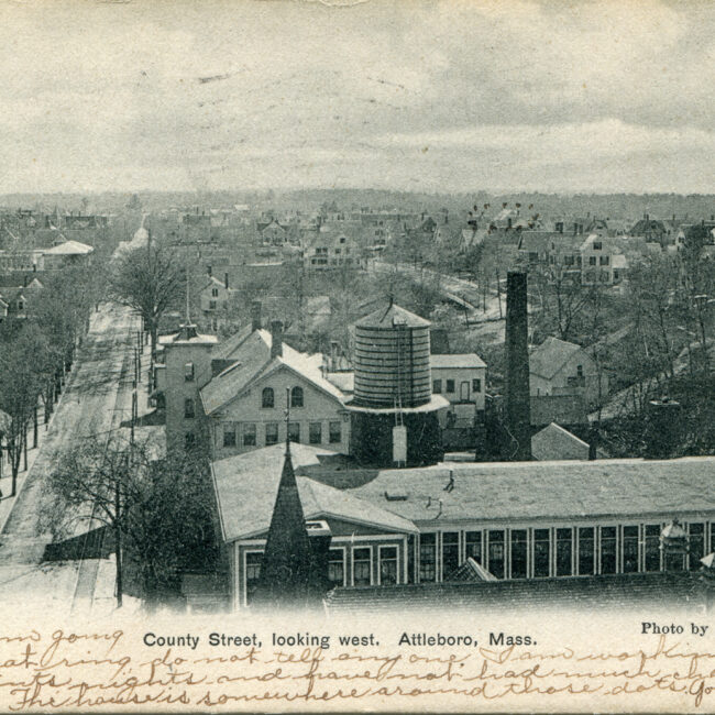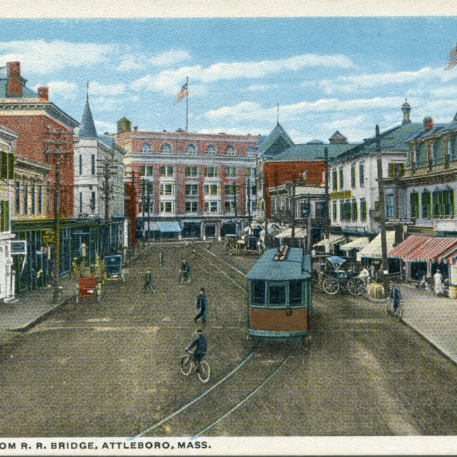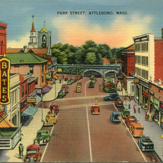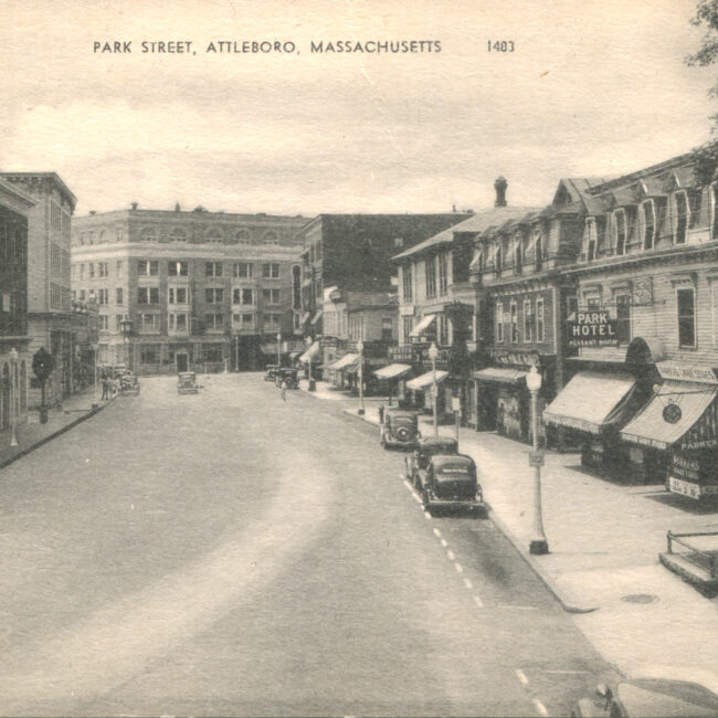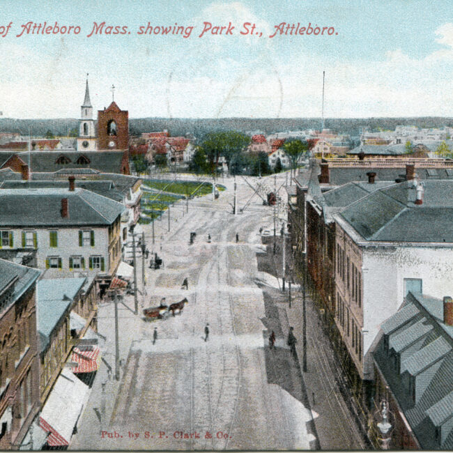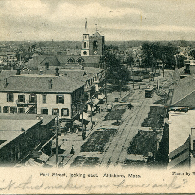 Transcription: Postmarked: History and Notes: Context: Main Image: The postcard features a view of Park Street in Attleboro, Massachusetts, as seen from the Railroad (R.R.)...