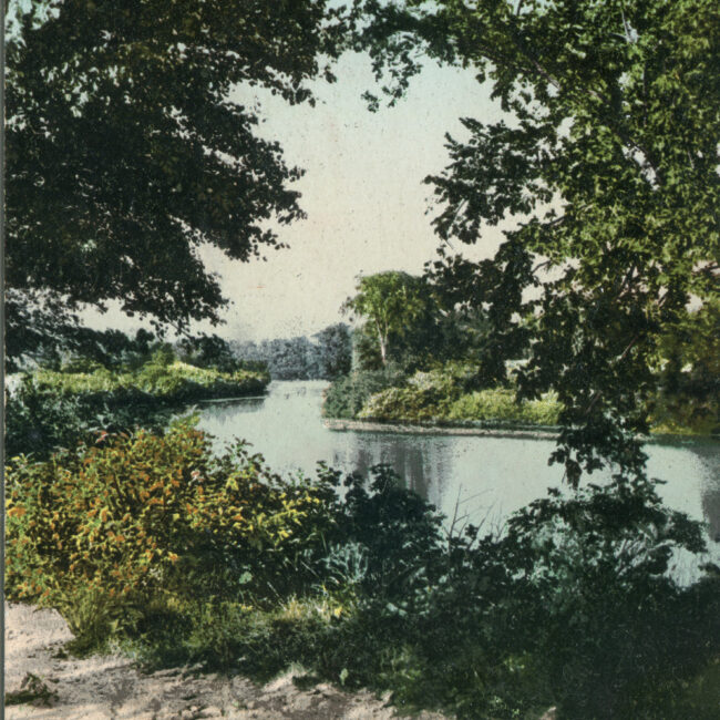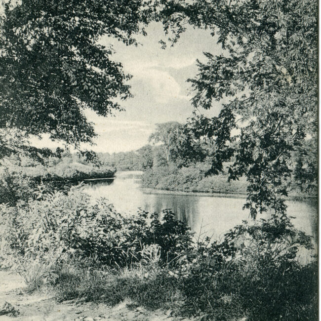 Transcription: Postmarked: History and Notes: Context: Main Image: The postcard features a serene lake view with a boathouse prominently displayed. Details: Foreground: The foreground consists...
