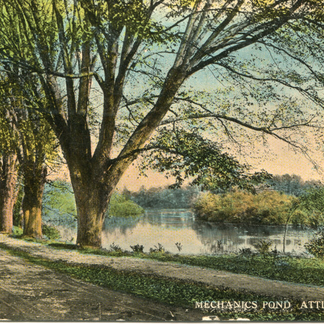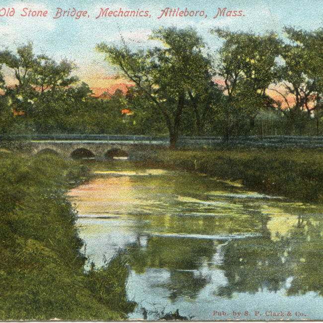 Transcription: Postmarked: History and Notes: Context: Main Image: The postcard showcases a tranquil river view in Attleboro, Massachusetts. Details: Foreground: The calm river occupies the...