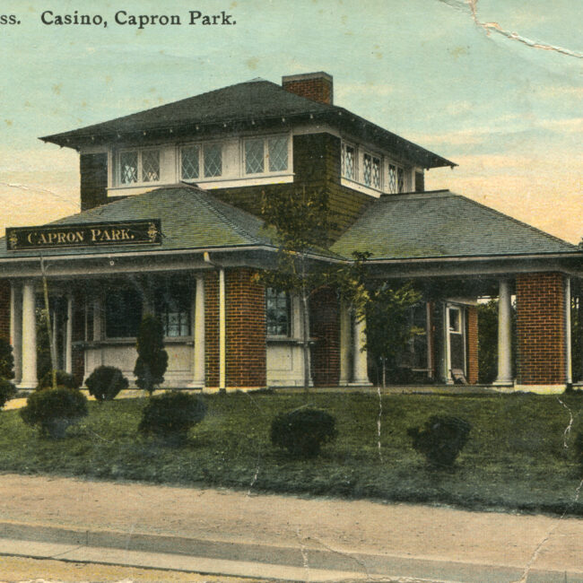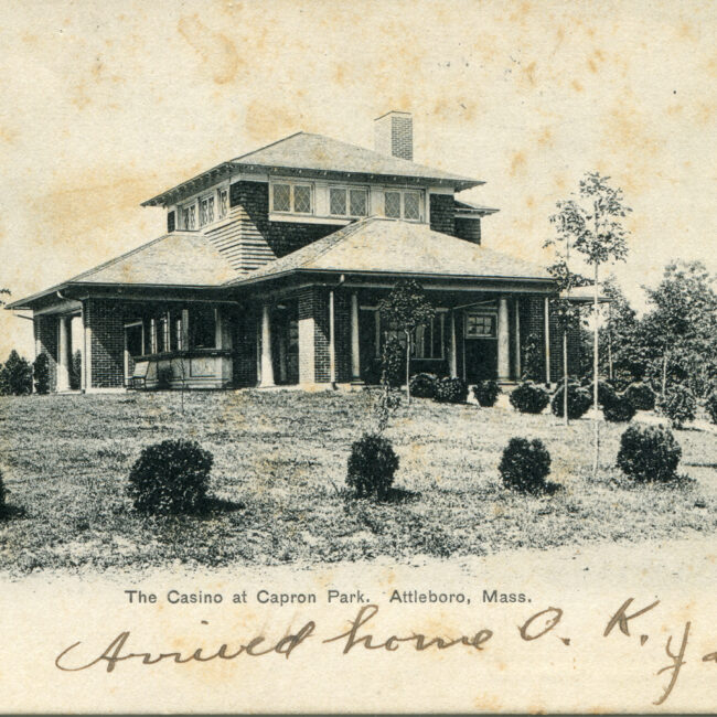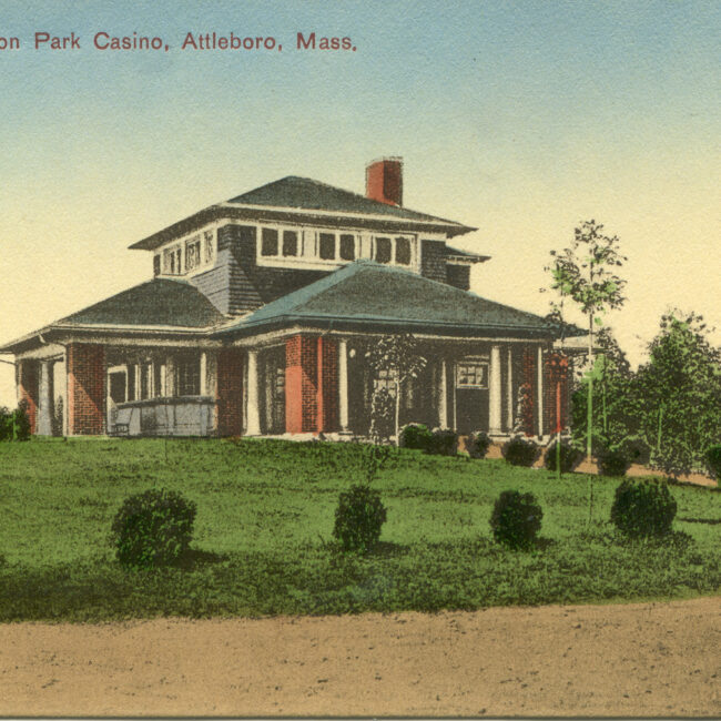 Transcription: Postmarked: History and Notes: Context: Main Image: The postcard features a colored illustration of the Capron Park Casino in Attleboro, Massachusetts. Details: Architecture and...