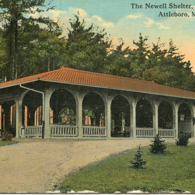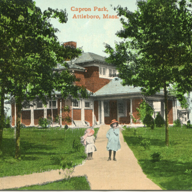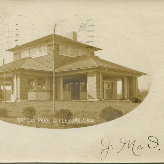 Transcription: Postmarked: History and Notes: Context: Main Image: The postcard features a colorized illustration of a structure within Capron Park in Attleboro, Massachusetts, with a...