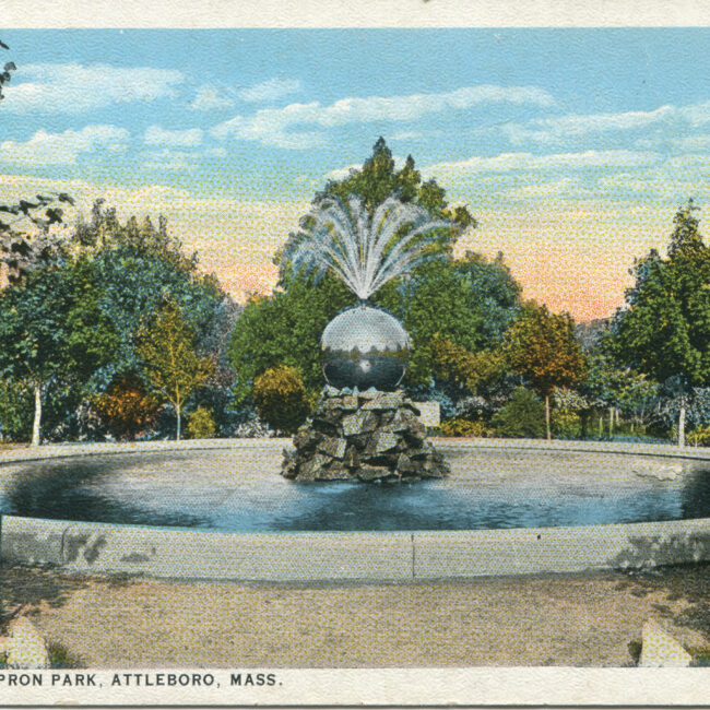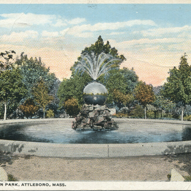 Transcription: Postmarked: History and Notes: Context: Main Image: The postcard showcases a colorful, vibrant image of the fountain in Capron Park, Attleboro, Massachusetts. The fountain...