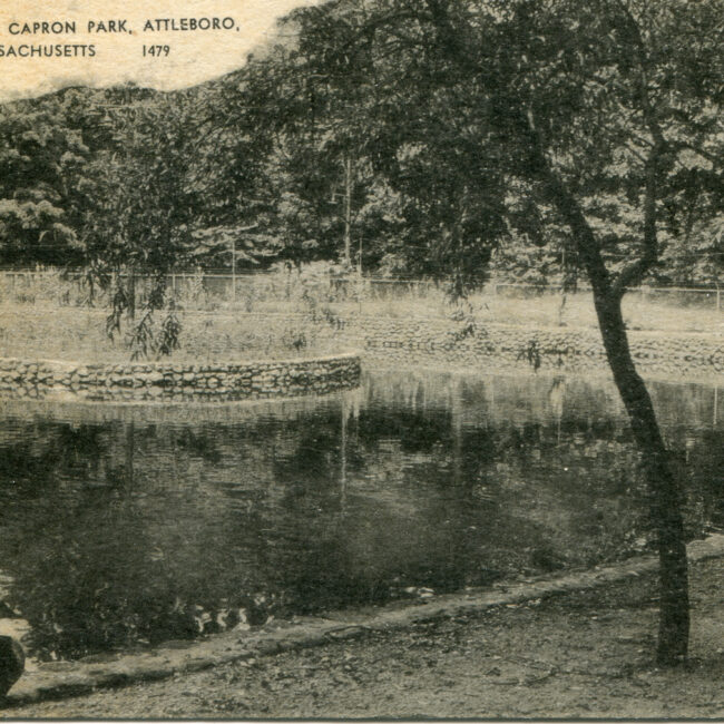 Transcription: Postmarked: History and Notes: Context: Main Image: The postcard features a sepia-toned photograph of the Duck Pond in Capron Park, Attleboro, Massachusetts, providing a...