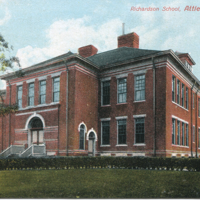 Transcription: Postmarked: History and Notes: Context: Main Image: The postcard features a black-and-white photograph of Richardson School in Attleboro, Massachusetts, from the early 20th century....