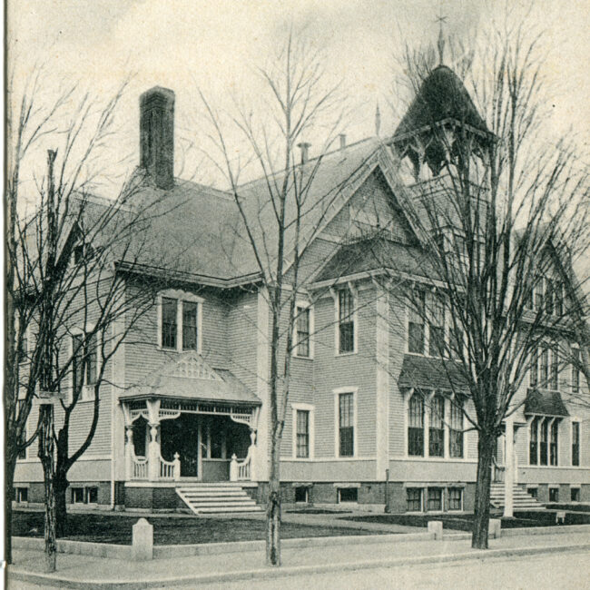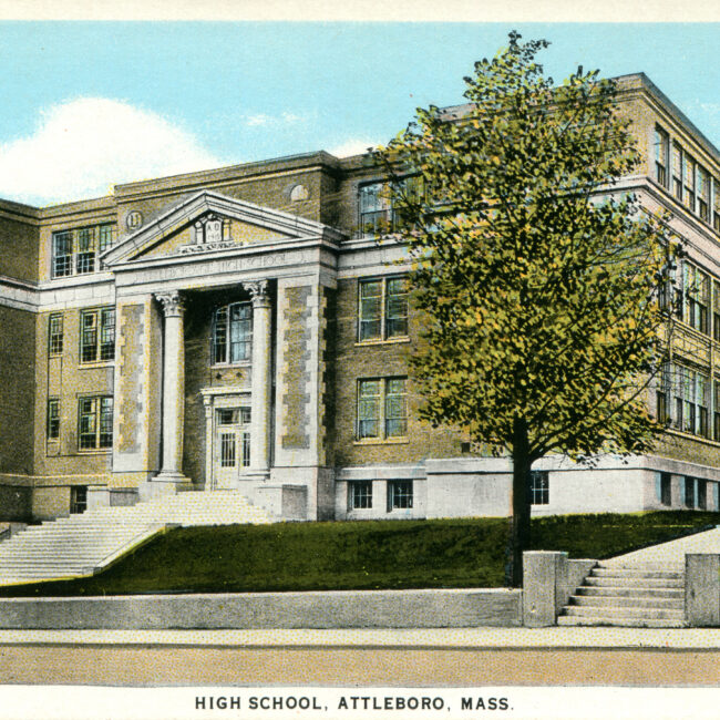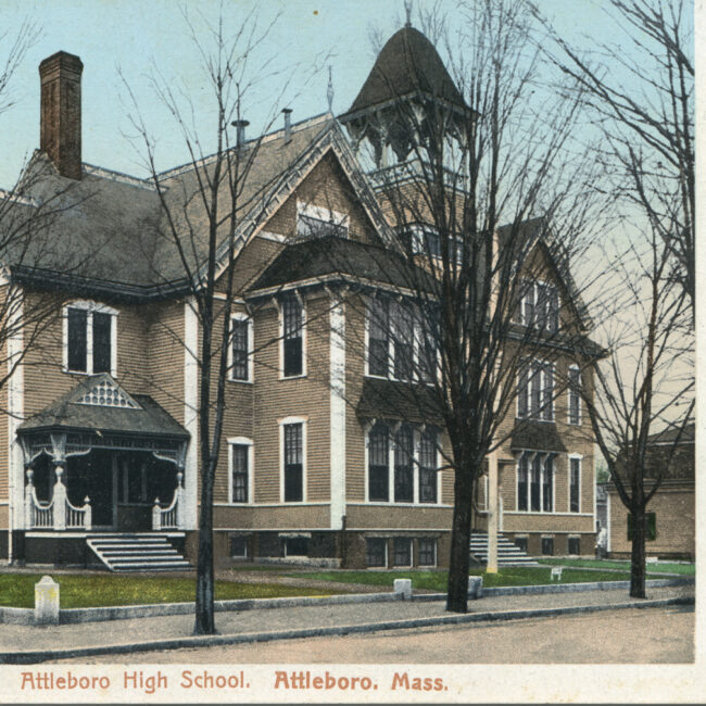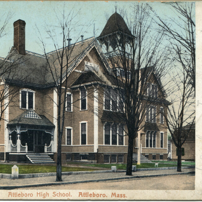 Transcription: Postmarked: History and Notes: Context: Main Image: The postcard features a black-and-white photograph of the High School in Attleboro, Massachusetts, from the early 20th...