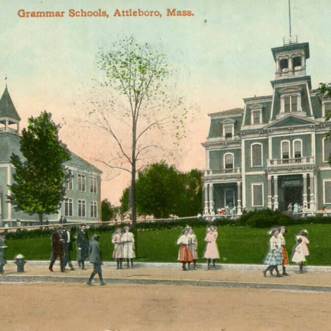 Transcription: Postmarked: History and Notes: Context: Main Image: The postcard features a vibrant colored illustration of Grammar Schools in Attleboro, Massachusetts. Details: Architecture: There are...