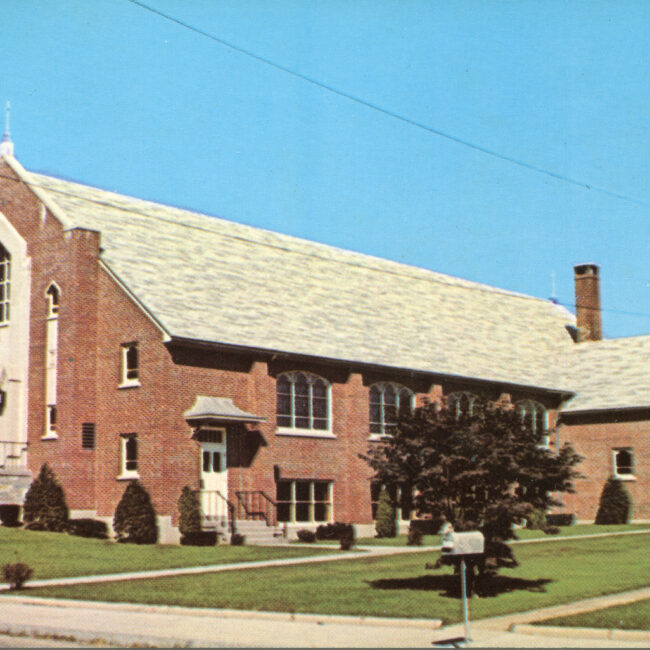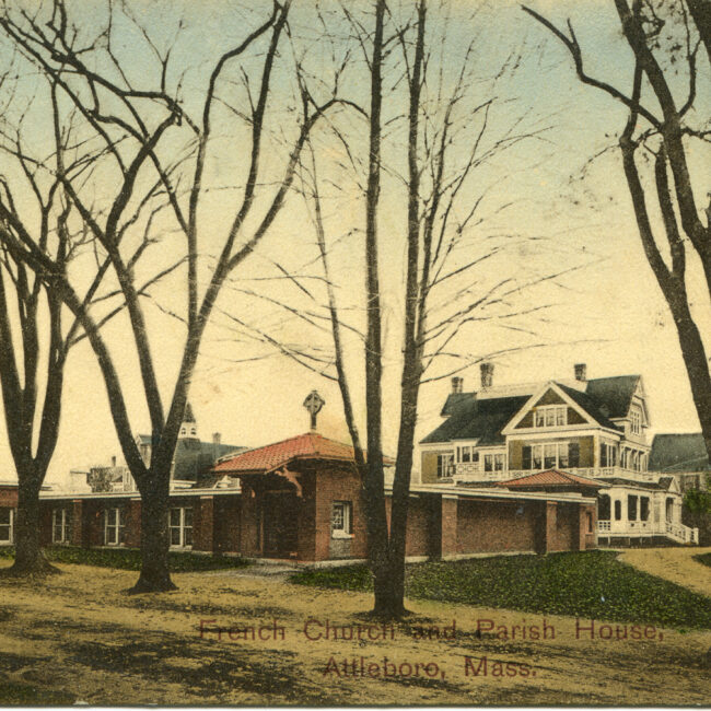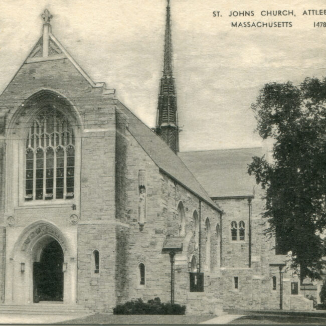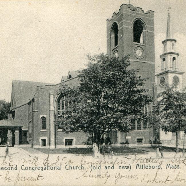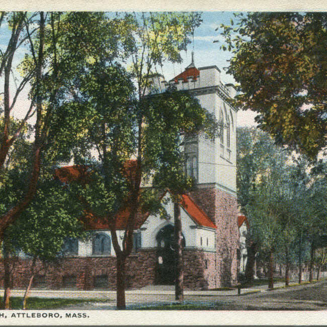 Transcription: Postmarked: History and Notes: Context: Main Image: The postcard features a color photograph of a church building in Attleboro, Massachusetts. Visual Details: Church Building:...
