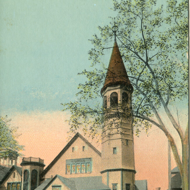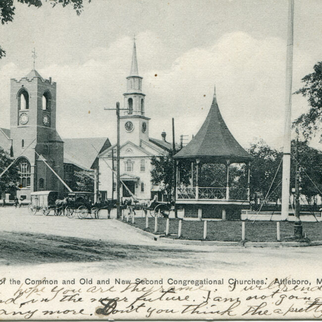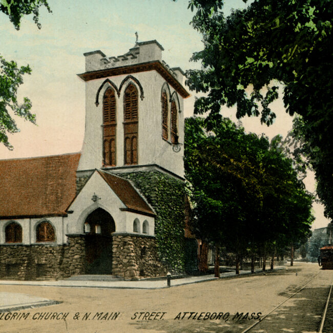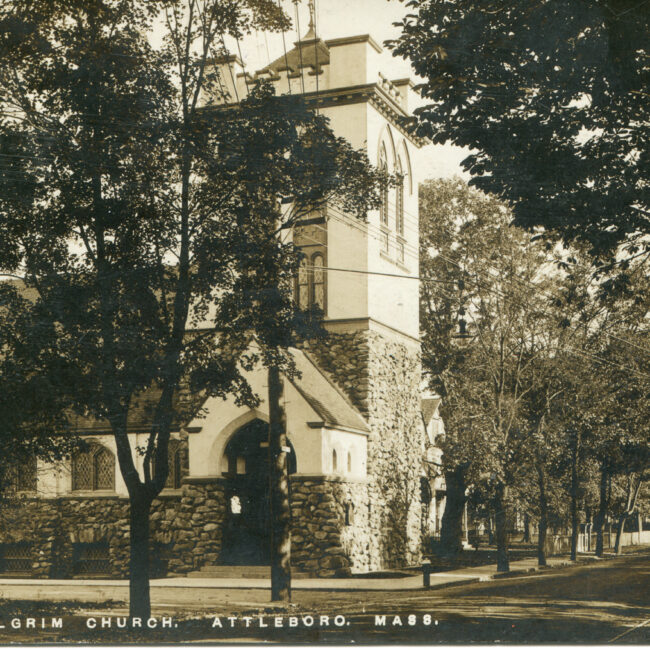 Transcription: Postmarked: History and Notes: Context: Main Image: The postcard features an illustration of Pilgrim Church in Attleboro, Massachusetts. Visual Details: Pilgrim Church: The church...