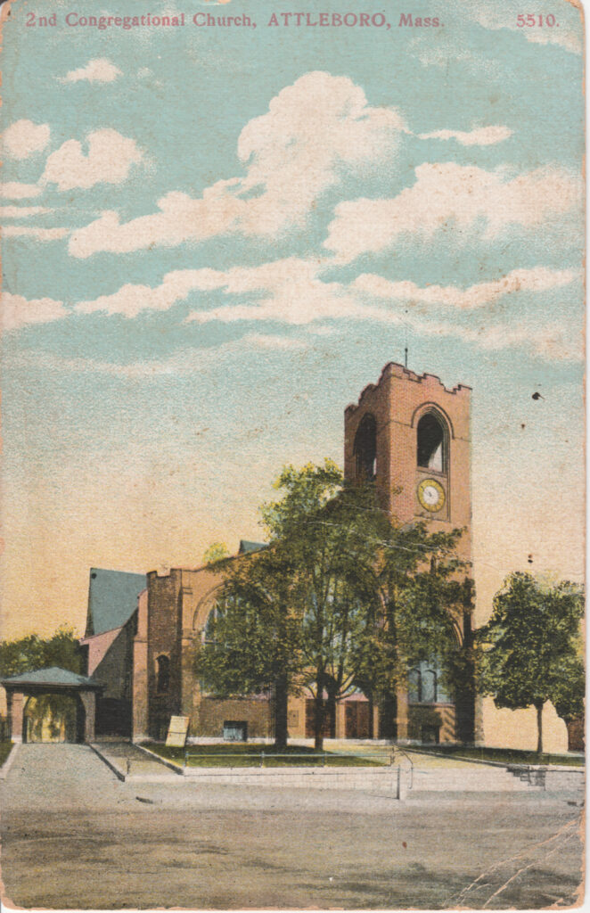 - The top of the postcard reads “2nd Congregational Church, ATTLEBORO, Mass.” in red lettering.