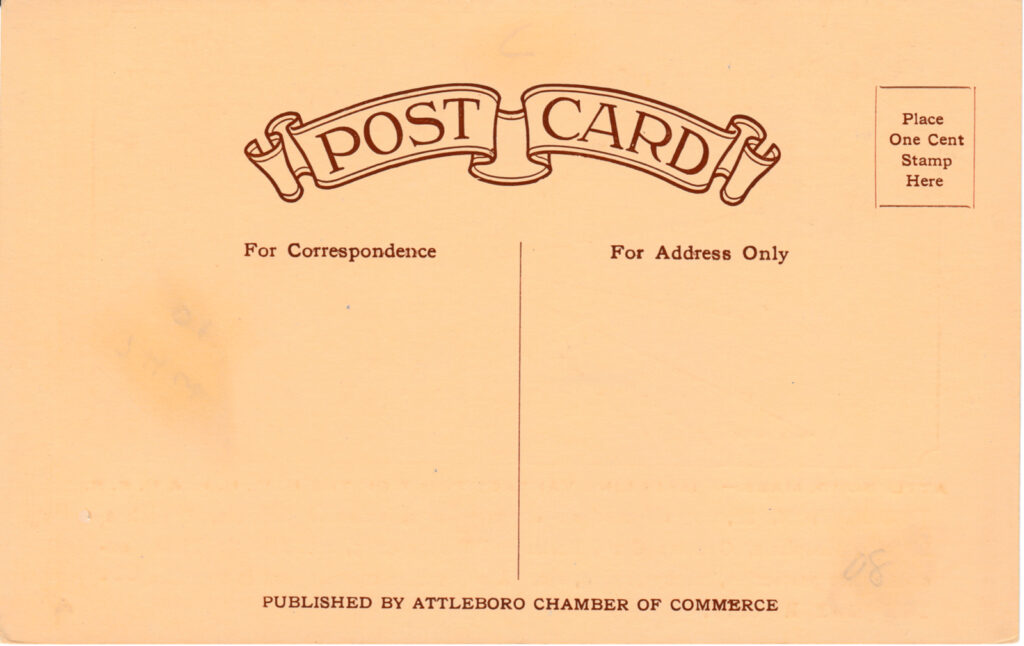 - Population and Amenities: The postcard mentions that Attleboro has a population of 20,000 and boasts various modern improvements and amenities. These include: