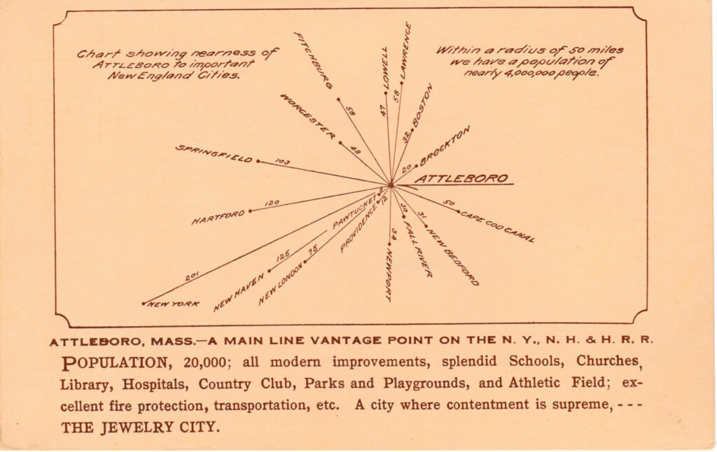 Main Image: The postcard features a chart illustrating the proximity of Attleboro to significant New England cities. This radial distance chart visually represents Attleboro at the center, with lines extending outward to various cities, indicating their distances in miles from Attleboro.