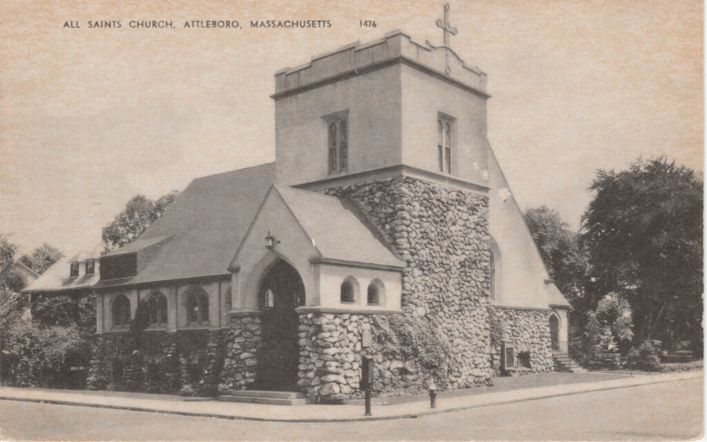 • The top of the postcard reads “ALL SAINTS CHURCH, ATTLEBORO, MASSACHUSETTS” in clear, uppercase letters.