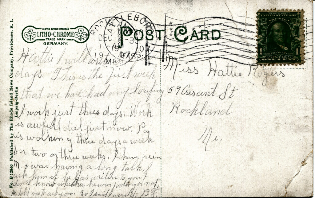 Hattie, I will write in a few days. This is the first week that we have had any loafing. I work just three days. Work is awful dull just now. Pa is working three days a week for two or three weeks. I have seen M. was having a long talk. I don’t know whether he was fooling or not. He told me to lay down 80. I don’t know whether he was fooling or not.