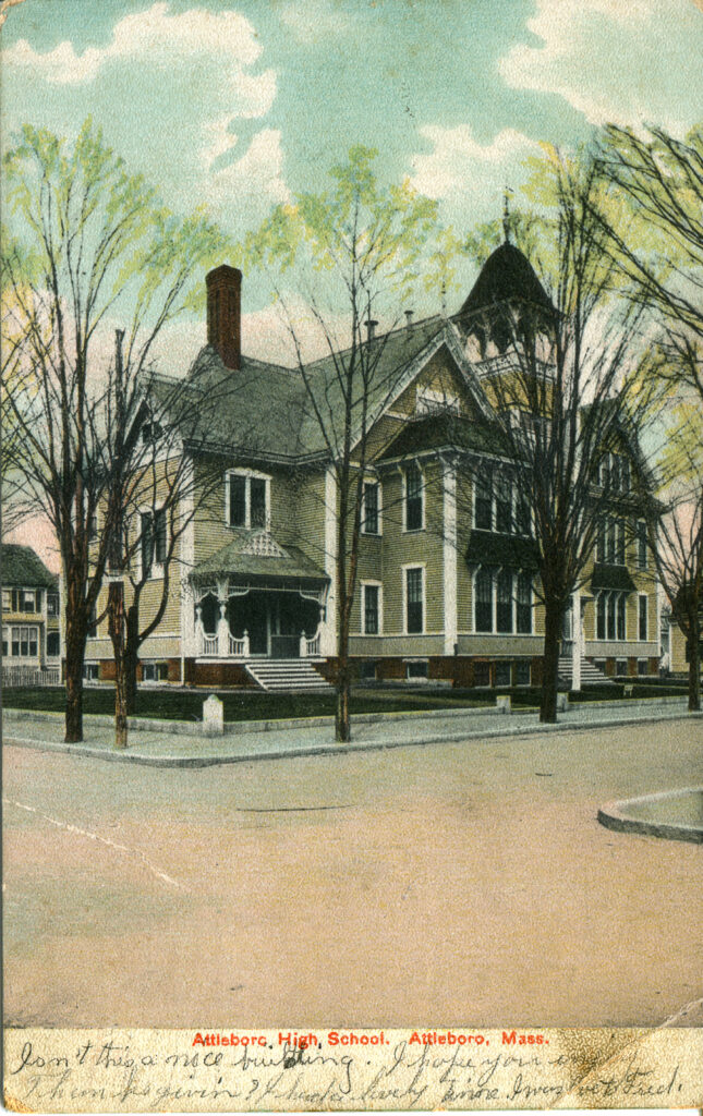 - The bottom of the postcard reads “Attleboro High School, Attleboro, Mass.” in a classic serif font, providing a formal and historical context.
