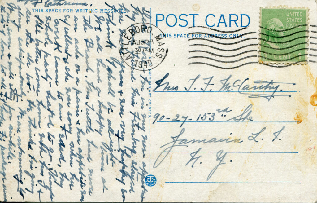 This is my new apartment. My cousin and his friends stayed here three weeks & were very happy so I think I shall be alright. We all had a happy time at the beach. Mrs. Tuttle had never an ache or a pain and her appetite was excellent — she was sorry when her work time came to an end. The whole party hated to go. Thought I’d better come home where [word] see the Dr. He thinks I’m going along satisfactorily. We are returning to [word] soon and will stay for a while. Love to all. I got the package [word].”