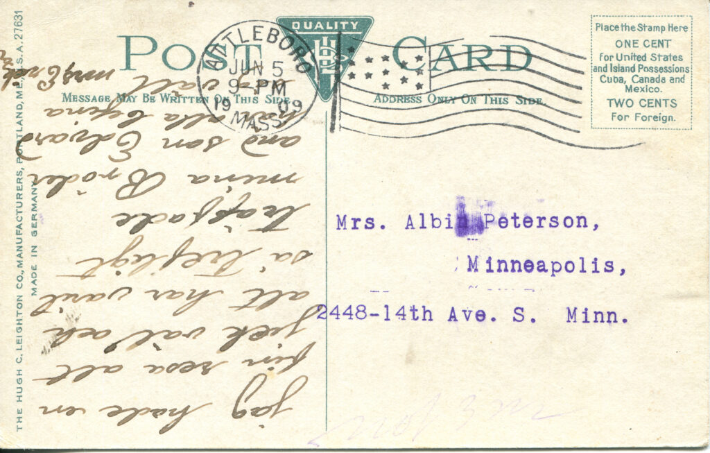 - Inscription: “Attleborough Public Library” is written in the bottom margin of the postcard.
