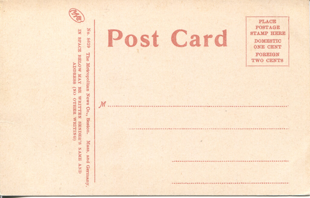 - A horse-drawn carriage is visible on the left side of the postcard, adding to the historical context.