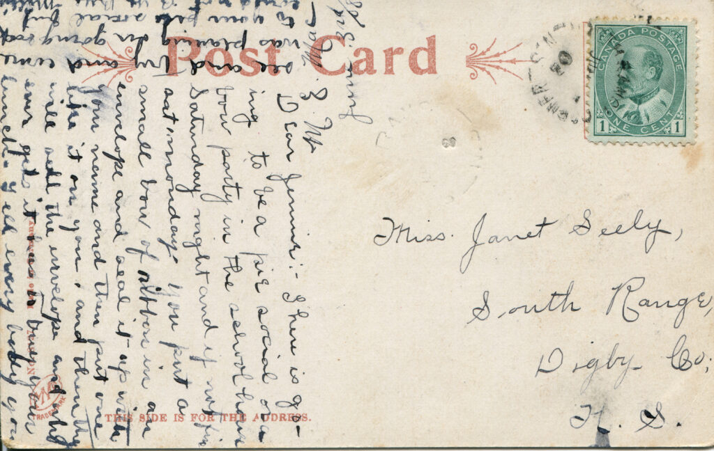 There is going to be a pie social party in the schoolroom Saturday night and next Monday mail one out of this envelope and I am and will put a name and address on this one and then put my name and address on it and you can see it in the … You will get an address from you, if I get a name and address. Your Aunt Janet