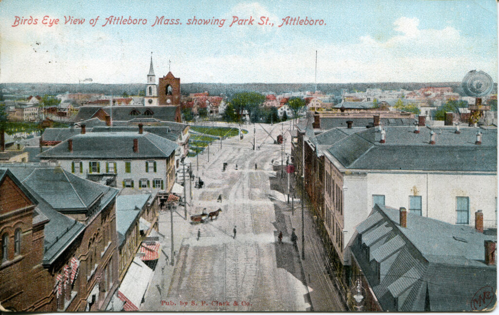 Context: Main Image: The postcard features a detailed color illustration of Attleboro, Massachusetts, viewed from an elevated position that provides a bird’s eye view of Park Street.
