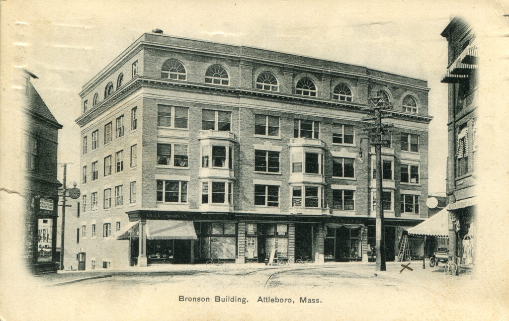 Context: Main Image: The postcard features the Bronson Building, a significant architectural structure in Attleboro, Massachusetts.