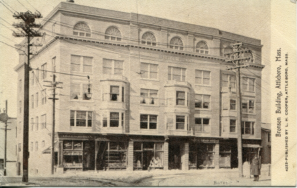 - The text on the right side reads, “Bronson Building, Attleboro, Mass.,” clearly identifying the location and building.