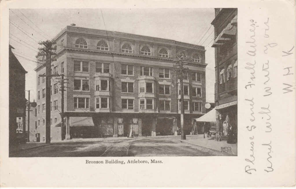 Context: Main Image: The postcard depicts the Bronson Building in Attleboro, Massachusetts.