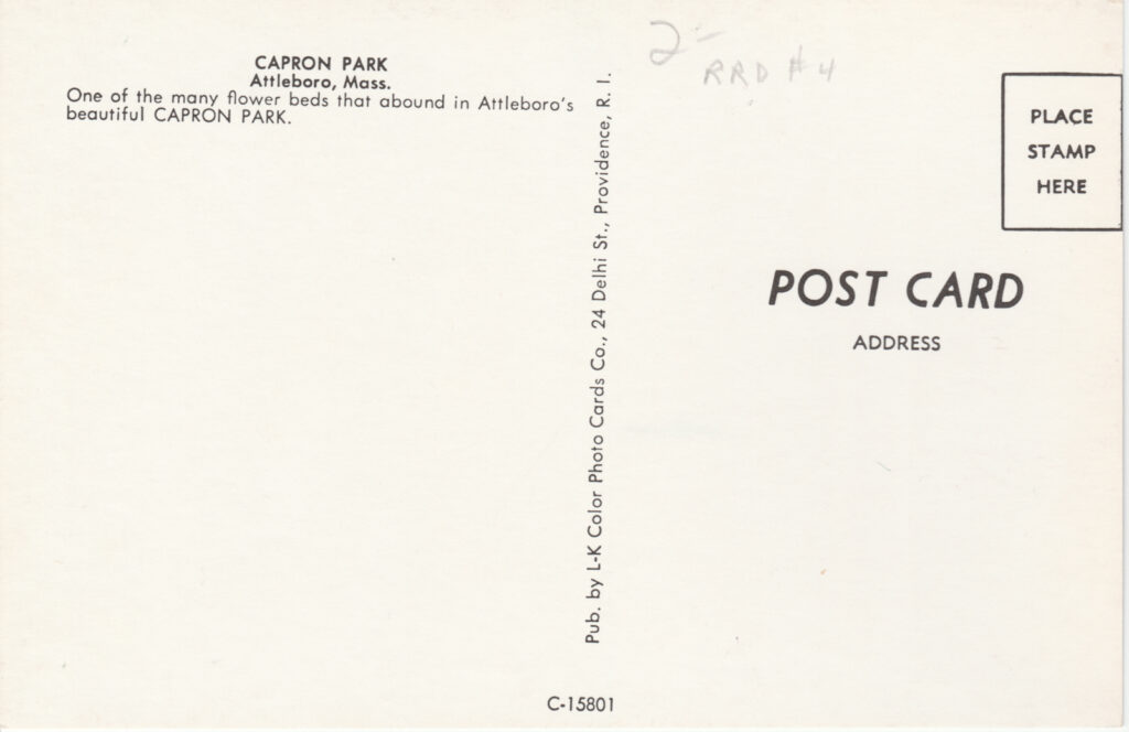 Context: Main Image: The postcard features a vibrant and colorful image of Capron Park in Attleboro, Massachusetts, highlighting its beautifully maintained gardens.