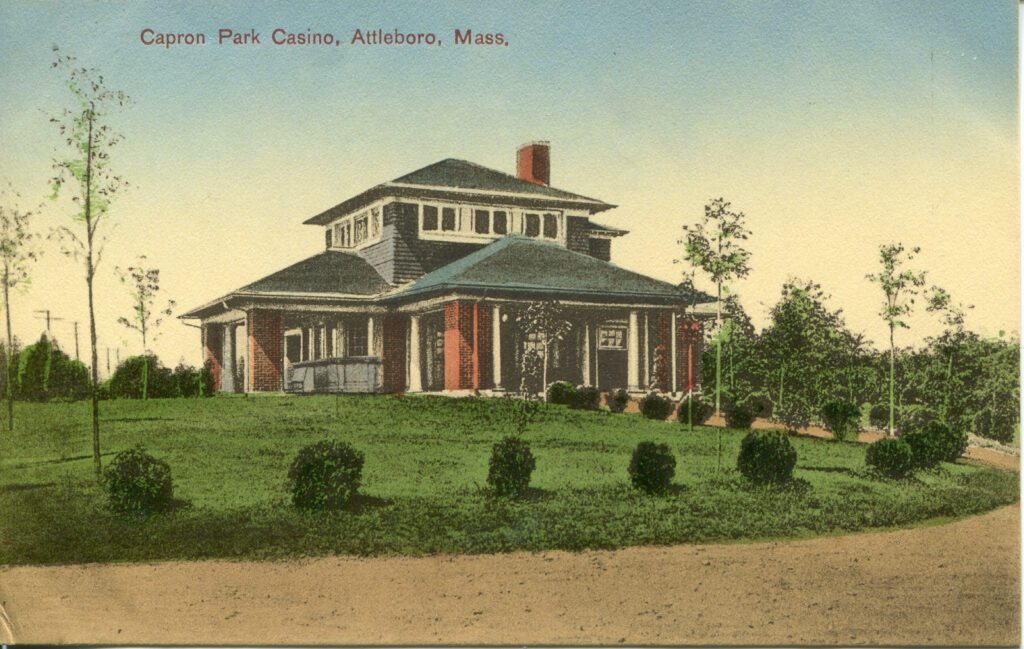 - The text on the postcard reads “Capron Park Casino, Attleboro, Mass.” providing a clear identification of the location and building.