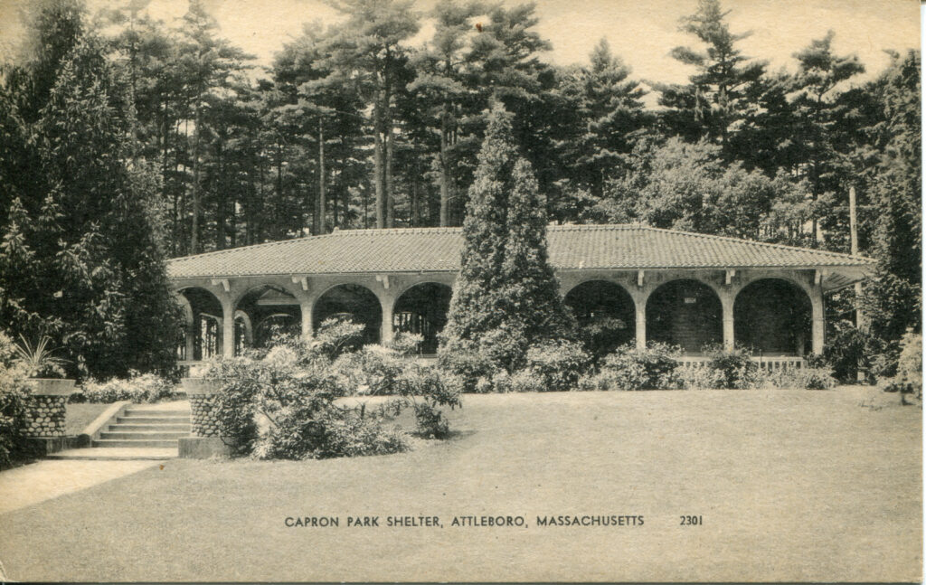 - The postcard includes the text “CAPRON PARK SHELTER, ATTLEBORO, MASSACHUSETTS” at the bottom, clearly identifying the location.