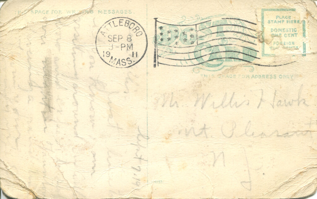 - The text on the postcard reads “Attleboro, Mass. Casino, Capron Park.” at the top, identifying the location and building.