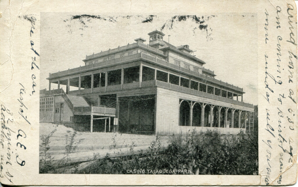 - The text on the postcard reads “Casino Talaquega Park” at the bottom, clearly identifying the location.