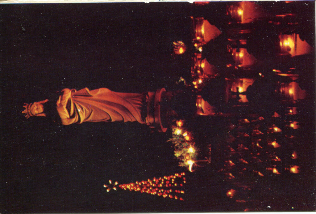 - The central feature of the postcard is a statue of a religious figure, likely a saint or a representation of Jesus, draped in robes and wearing a crown. The statue is lit from below, casting dramatic shadows and highlighting its details.