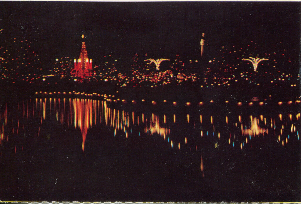 - The main focus of the postcard is the extensive array of festive lights, including a prominently illuminated structure that resembles a Christmas tree, adorned with red and white lights.
