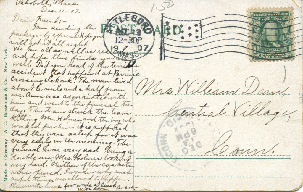 We are all as well as usual and hope this finds you well. Did you read of the terrible accident that happened at Perrin’s Crossing? The man lived about a mile and a half from us. And we were acquainted with him and went to the funeral today. The train struck the team killing Mr. Holmes and the boy who worked for him. It is supposed that they were asleep for it was very early in the morning. The funeral was very sad. Being a double one. Mrs. Holmes took it very hard. Neither of the caskets were opened. I wonder why such awful things are allowed to happen. Please write me a few words soon.