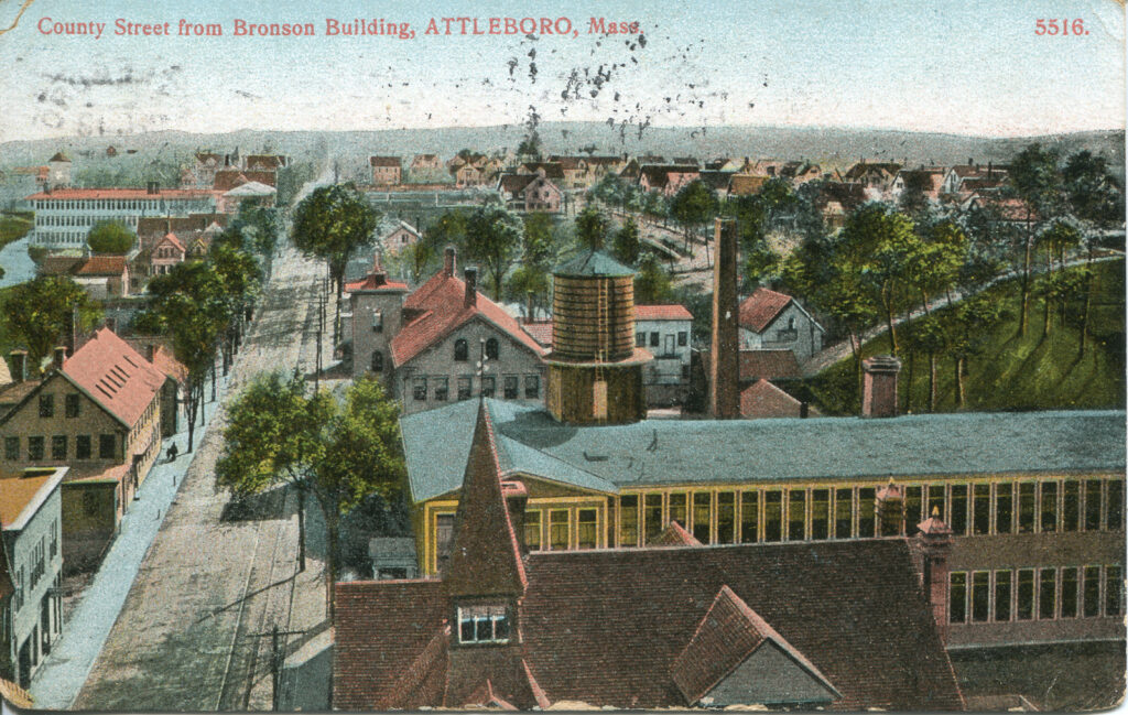 Context: Main Image: The postcard features a colored illustration of County Street as seen from the Bronson Building in Attleboro, Massachusetts.
