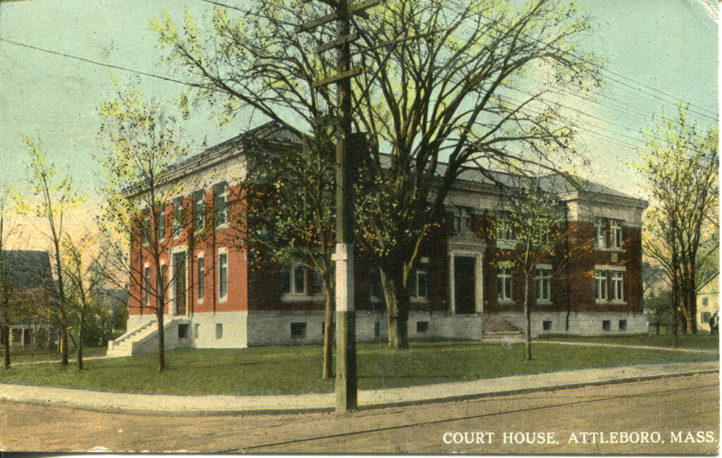 Context: This postcard features an image of the Courthouse in Attleboro, Massachusetts. The building is a two-story structure made of red brick with white stone accents around the windows and entrance. The architecture includes a classical style with columns flanking the main entrance and a symmetrical design. The courthouse is surrounded by a grassy lawn with several trees, some of which are without leaves, indicating the season might be early spring or late fall. A sidewalk and a utility pole are visible in the foreground. The postcard likely dates from the early 20th century, based on the architectural style and the presence of utility poles and the surrounding environment. The text on the postcard reads “COURT HOUSE, ATTLEBORO, MASS.”