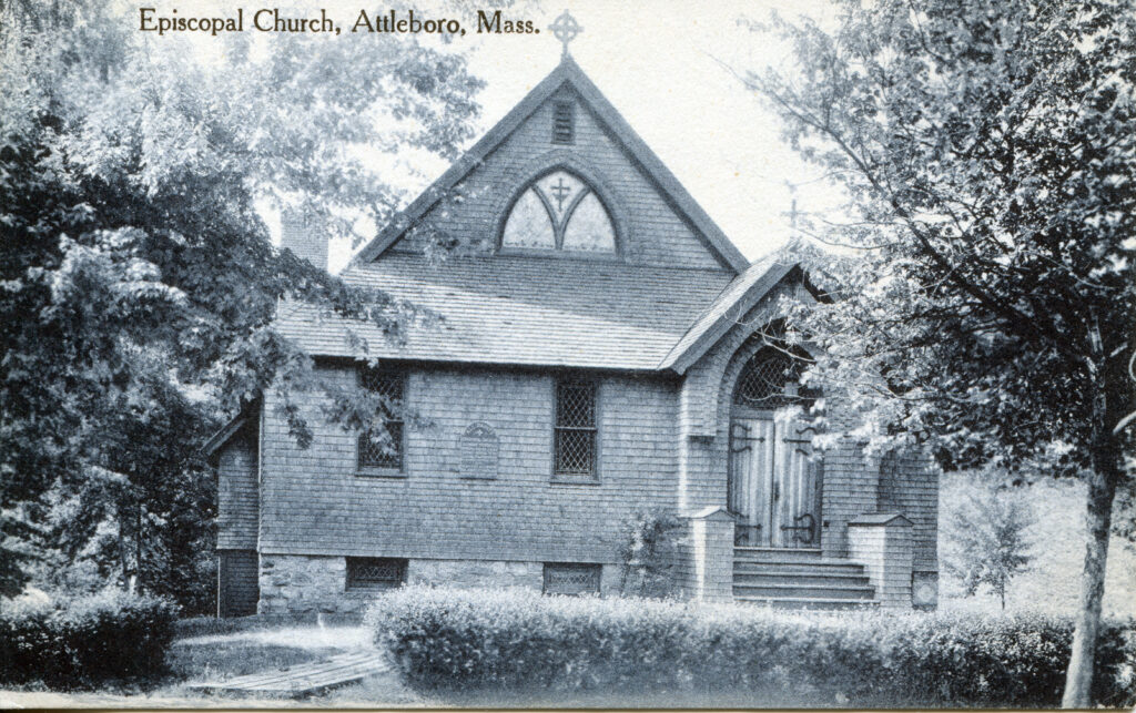 Context: Main Image: The postcard depicts the Episcopal Church in Attleboro, Massachusetts, framed by trees and greenery.