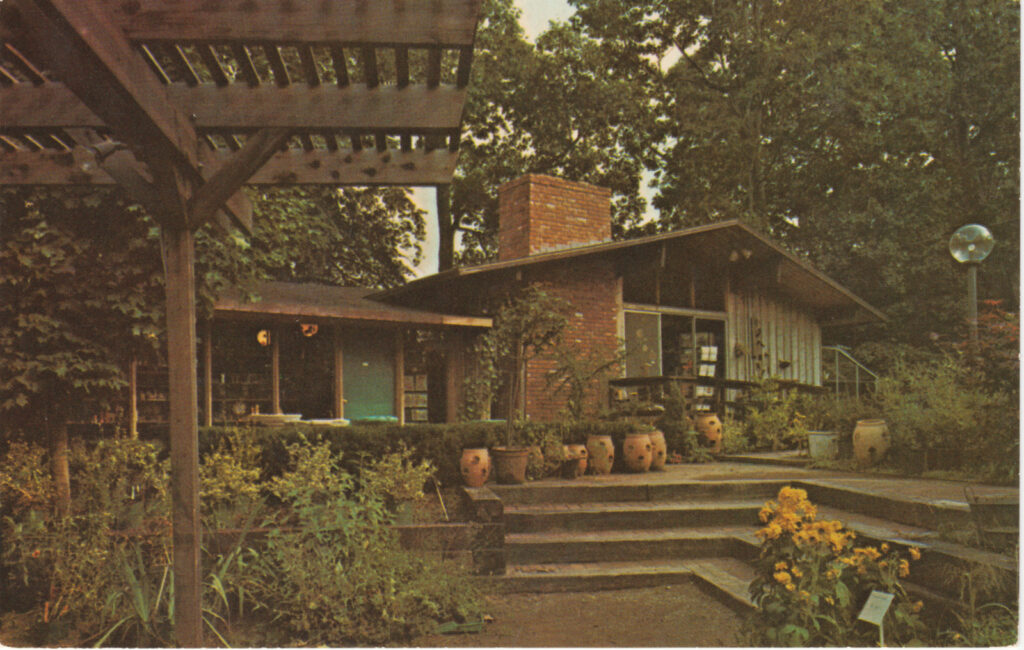 - Main Image: This postcard features a color photograph of a modern-style home/business surrounded by lush greenery. The home/business has a prominent brick chimney, large windows, and a patio area with several potted plants. There is a pergola structure in the foreground, and the steps leading up to the home are lined with yellow flowers.